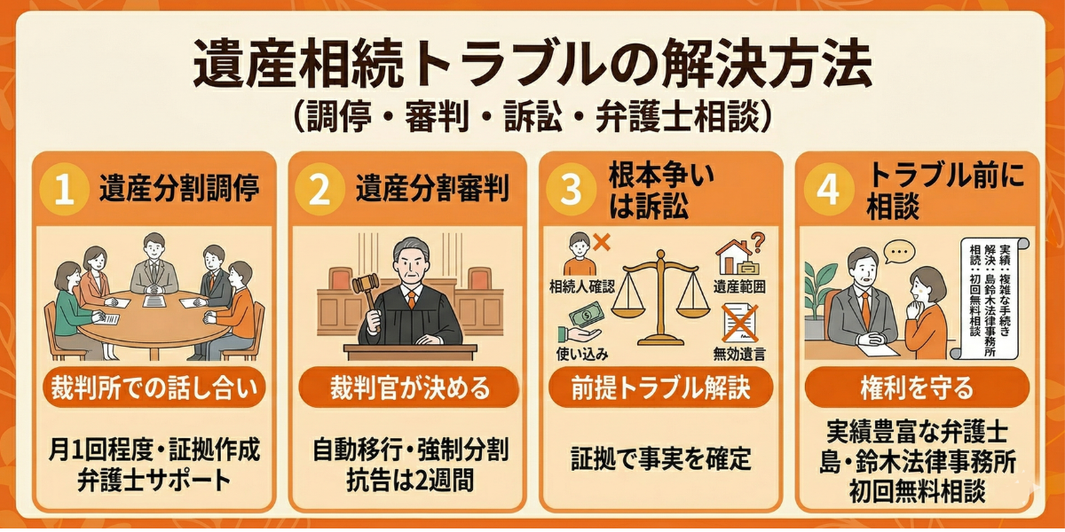 【前提問題の調査】→【訴訟(争いがある場合)】→【遺産分割調停】→【遺産分割審判】→【不服申立て(高等裁判所へ)】